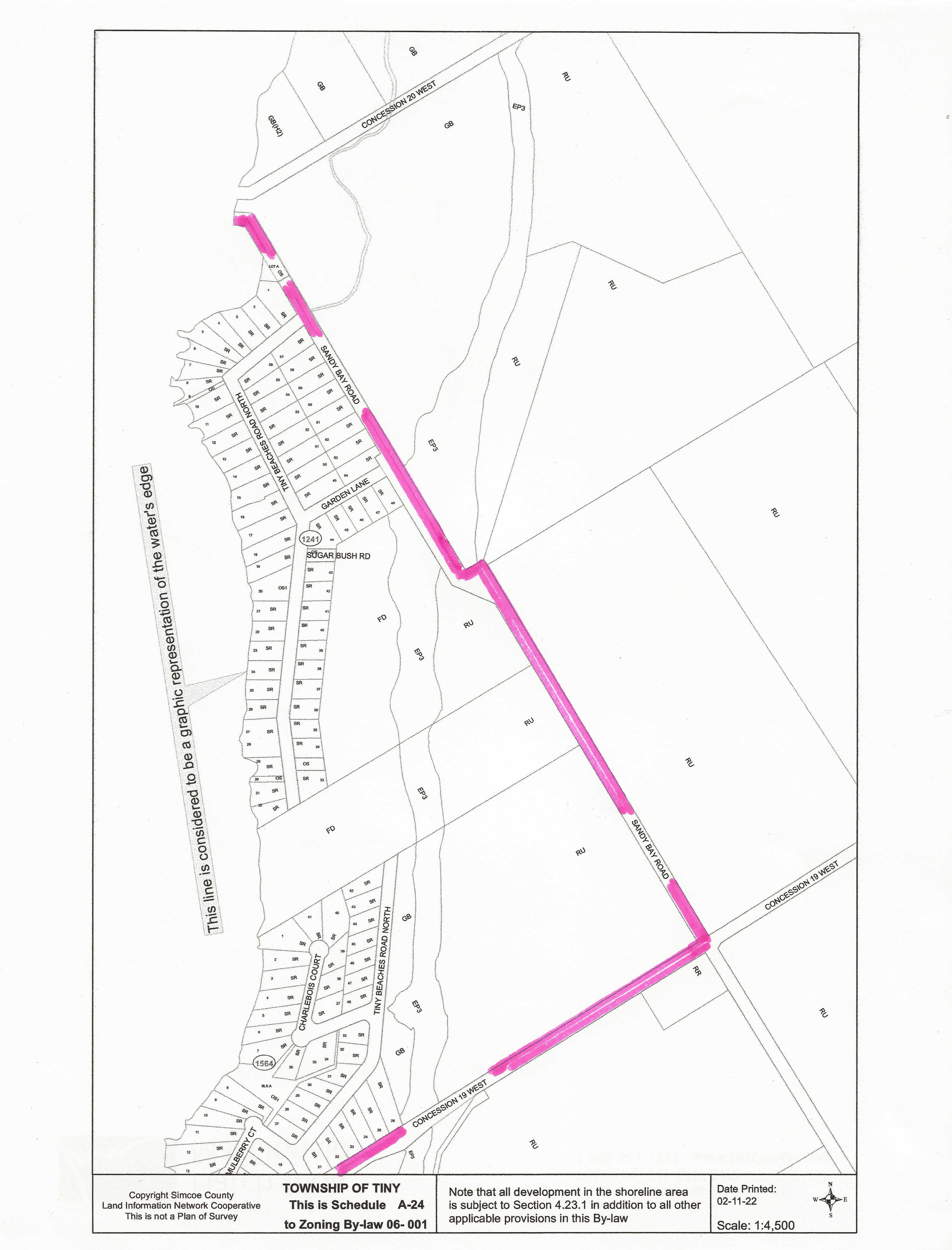 Mary W. J. King owned the highlighted land on what is now known as Schedule A-23 and Schedule A-24 of the Township of Tiny Zoning By-Law 06-001 (the up-to-date zoning maps are available online from the Township of Tiny website: Schedule A-23 and Schedule A-24). In the early 1950’s, she and her associates sub-divided her property in two stages, Kingswood North (Registered Plan 1241) and Kingswood South (Registered Plan 1564).